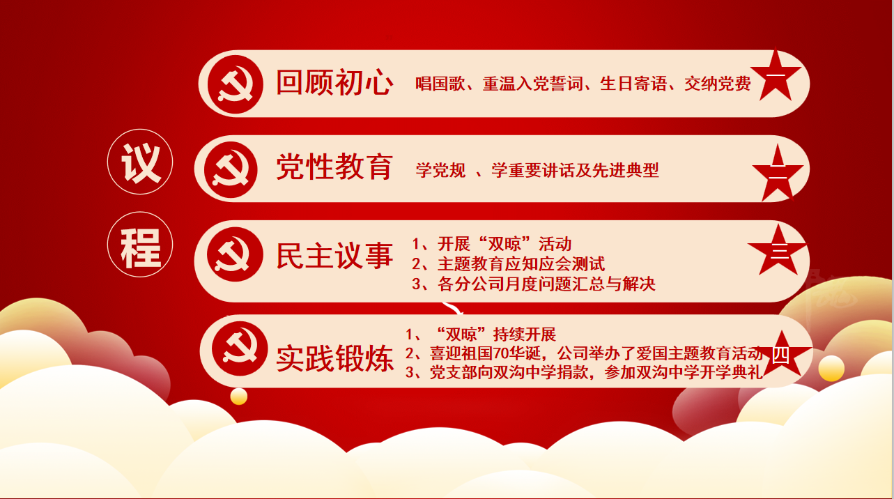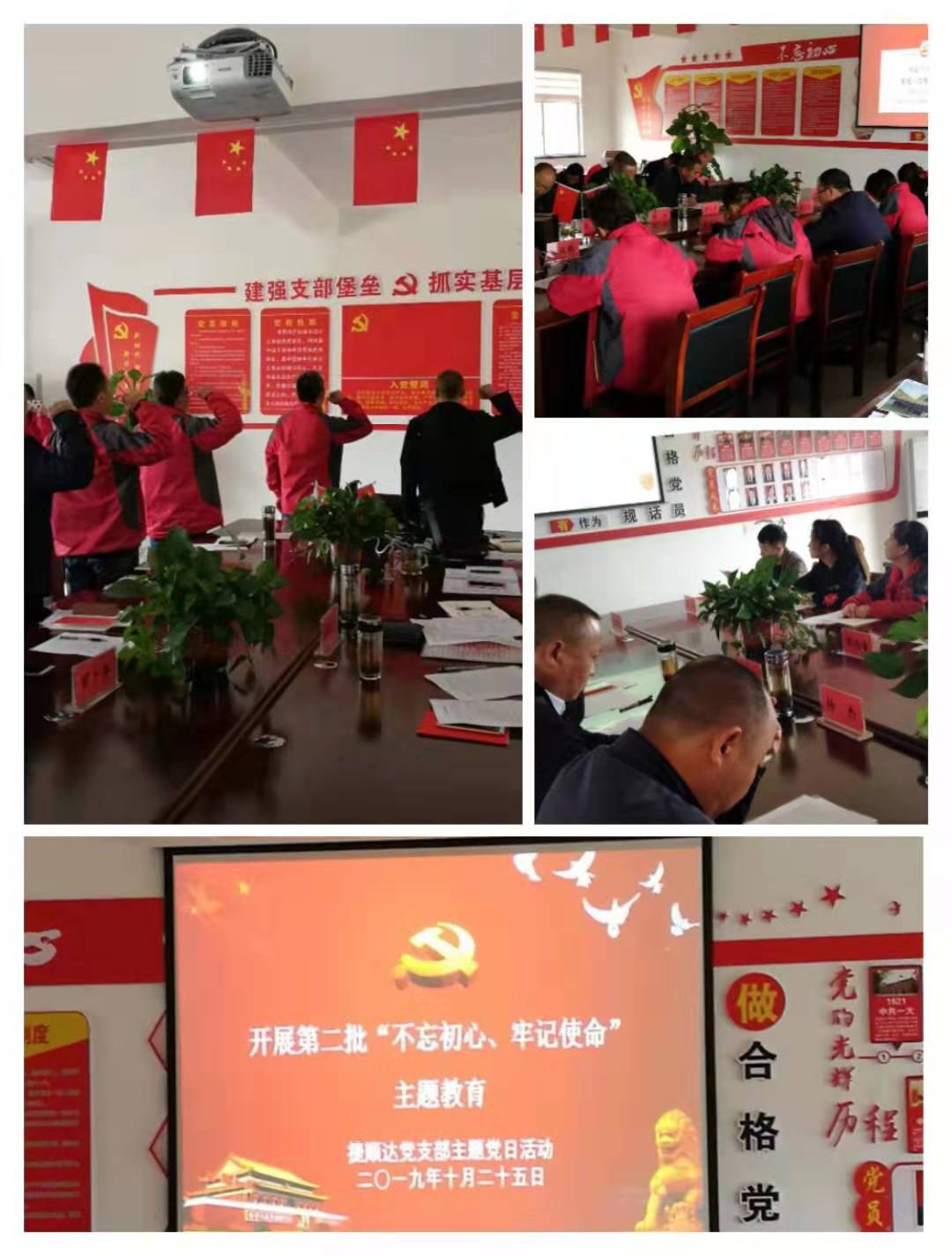2019年10月25日下午14:30捷順達(dá)黨支部召開了本月黨建會(huì):開展第二批“不忘初心,牢記使命”主題教育;本次會(huì)議共有4大項(xiàng);1、回顧初心 2、黨性教育 3、民主議事 4、實(shí)踐鍛煉
