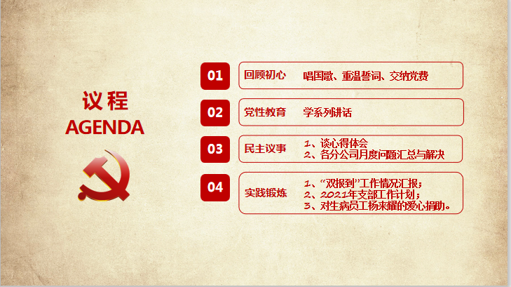 1、回顧初心:內(nèi)容包括唱國(guó)歌、重溫入黨誓詞、按月交納黨費(fèi)。