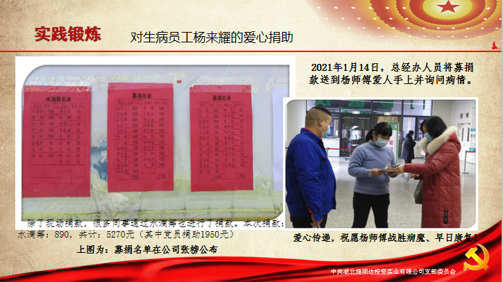 黨支部倡議為生病員工楊來(lái)耀捐款,黨員同志們積極發(fā)揮模范帶頭作用,紛紛為生病員工伸出援手,員工們也積極響應(yīng),捐款共計(jì)5270元。